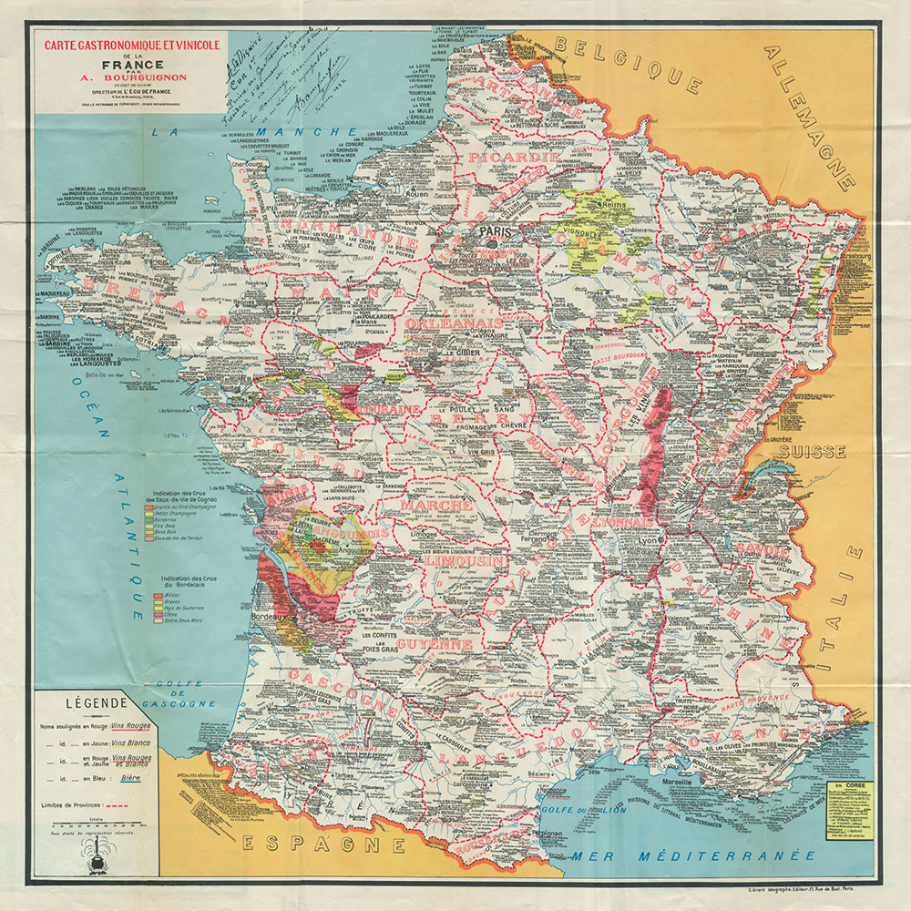 CARTE GASTRONOMIQUE ET VINICOLE DE LA FRANCE PAR A. BOURGUIGNON (Ex-Chef de Cuisine – Direkteur de L’Ecu de France Paris) SOUS LE PATRONAGE DE CURNONSKY – PRINZ DES GASTRONOMES
