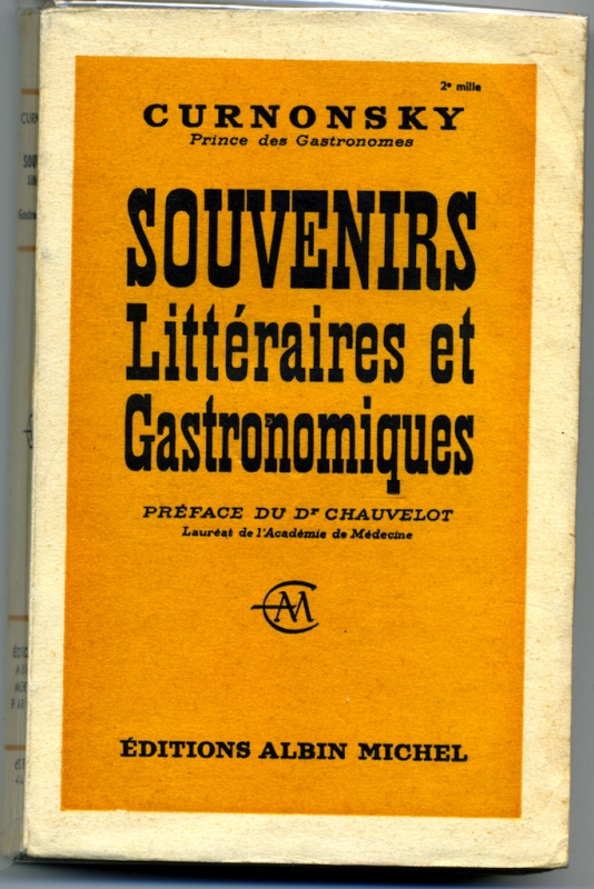 Marcel Rouff (1877-1936), Schweizer Schriftsteller, Dramatiker, Journalist und Historiker. Er verfasste ein imposantes literarisches Werk, von dem ein Teil der Gastronomie gewidmet ist. Ab 1921 schrieb Curnonsky mit seinem Freund Marcel Rouff die Serie „LA FRANCE GASTRONOMIQUE, guide des merveilles culinaires et des bonnes auberges françaises.“ Eine Sammlung von 28 Bänden über die regionale Küche und die besten Restaurants in Frankreich. Gleichzeitig schrieb Marcel Rouff zwei Romane, in denen man einige Episoden im Leben seines Freundes „Curn“ wiedererkennt. Der Roman „LA VIE ET LA PASSION DE DODIN-BOUFFANT“ wurde 1924 veröffentlicht. Hier begegnen uns die Geschichte von Rana-Rouri und einige wilden Affären, Curnonsky alias Bibendum … Die Erstausgabe von Dodin-Bouffant, enthielt eine Widmung an Curnonsky: Du wirst sehen, mein lieber Freund, sie werden Dich in diesem Buch alle wieder erkennen, sie werden bald merken, dass sich hinter der Figur des Dodin-Bouffant kein anderer als Curnonsky versteckt. Der zweite Roman trug den Titel: GUINOISEAU ou LE MOYEN DE NE PAS PARVENIR, die Geschichte über Curnonsky erschien 1926 (Guinoiseau, alias Curnonsky).